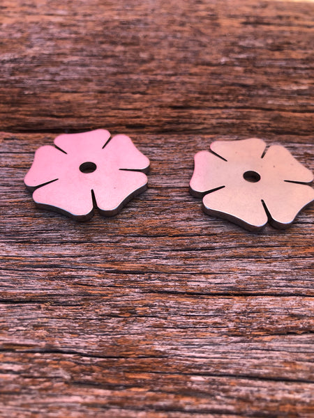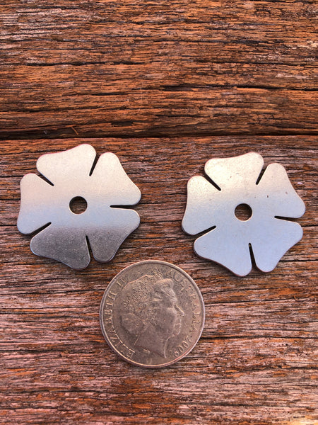 One pair of stainless steel brushed large clover Dutton spur rowels, pins and cotter pins included.