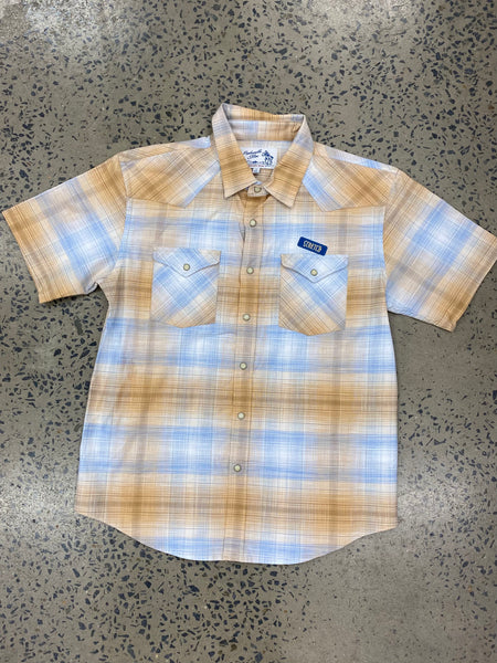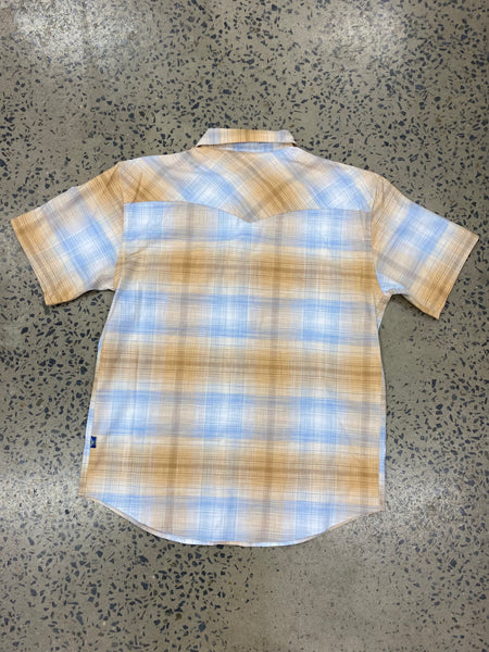 Panhandle men's short sleeved western shirt in a brown stripe print. Full snap button down with two chest pockets. 97% Cotton & 3% Spandex.