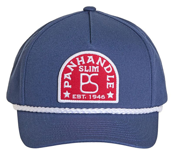 Panhandle Slim full fabric cap with an embroidered red patch featuring a rope and curved brim.
