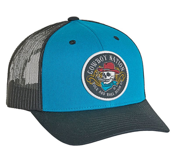 Rock and Roll Denim curved brim, meshback cap featuring a patch design in teal and black.