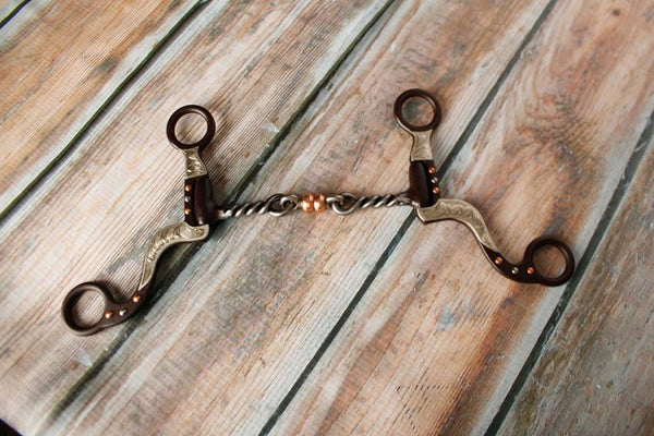 This solid sided twisted mouth shank bit features a dogbone centre and engraved silver overlay as well as copper and silver stud detailing on the cheeks.
