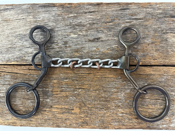 Dutton 'OC' Old Cowboy Bit featuring a short shank with a large loose ring for pre-signal rein slide. Straight chain mouthpiece with copper rings.
