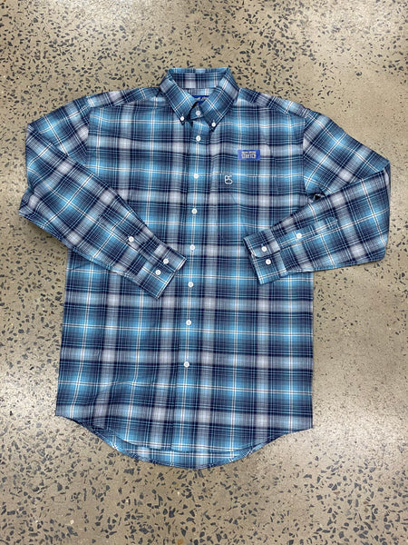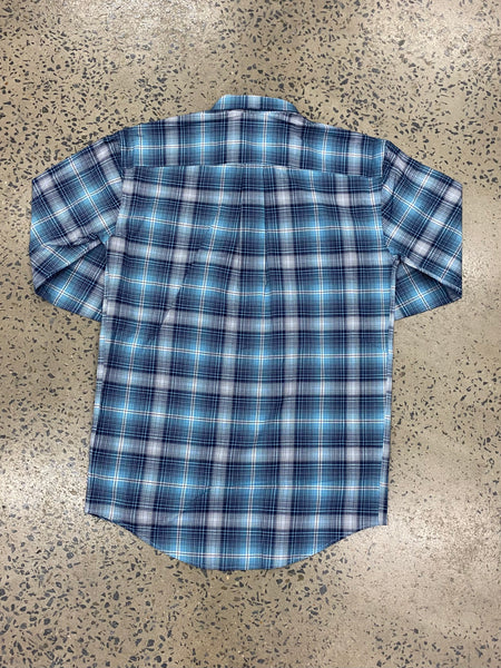 Panhandle select men's long sleeved western shirt with one open pocket. Button up front. These shirts a great fitting, have long sleeves and long tails. 97% Cotton & 3% Spandex.