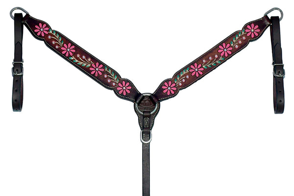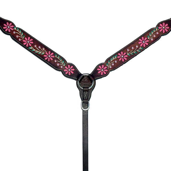 Matching leather bridle and breastplate featuring floral tooling with silver studs and hardware.